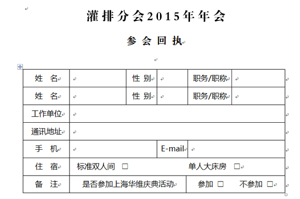 1、请各单位参会代表于2015年12月25日前将此表及付款凭证以电子邮件的方式发至灌排分会,灌排分会秘书处与承办方将按此表预定和安排房间;灌排分会电子邮件: iachina@163.com;