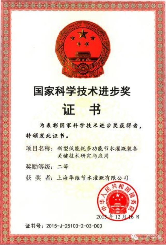 【华维 讯】2015年12月16日,上海华维节水灌溉股份有限公司荣获国家科学技术进步二等奖,是继“上海市高新技术企业、上海市科技小巨人企业、国家科技部科技型中小企业技术创新基金项目、高新技术成果转化项目”等荣誉后,华维再次斩获的国家级创新型奖项。