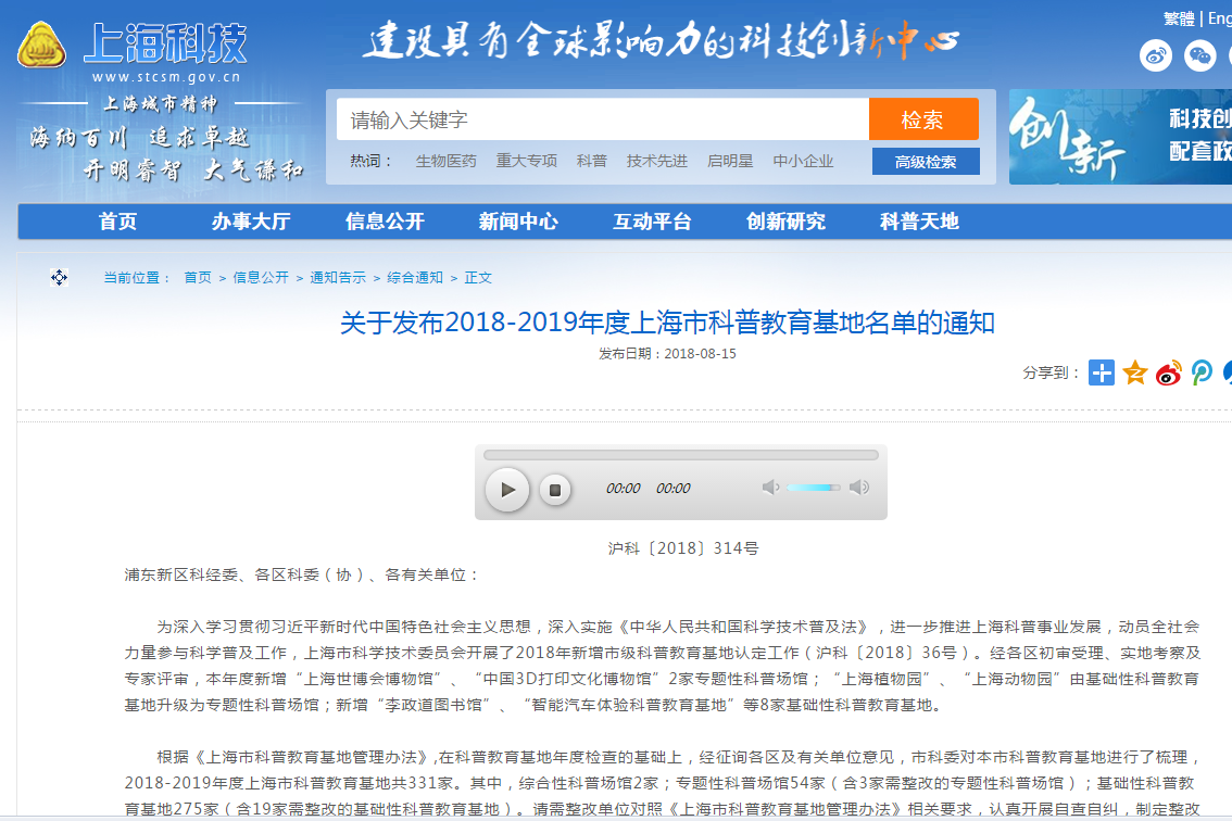 为深入学习贯彻习近平新时代中国特色社会主义思想,深入实施《中华人民共和国科学技术普及法》,进一步推进上海科普事业发展,动员全社会力量参与科学普及工作,上海市科学技术委员会开展了2018年新增市级科普教育基地认定工作(沪科〔2018〕36号)。