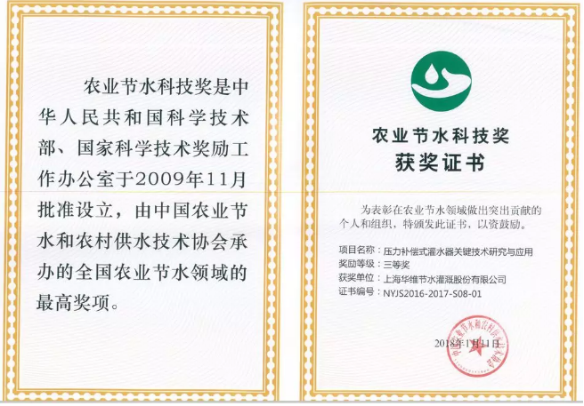 2018年9月18日,中国农业节水和农村供水技术协会第三次会员大会暨农业节水科技奖颁奖大会在北京召开。上海华维荣获“农业节水科技奖”,这是我国农业节水行业科技发展水平的最高奖项。