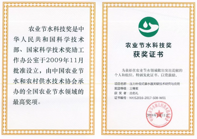 上海华维节水灌溉股份有限公司“压力补偿式灌水器关键技术研究与应用”项目斩获农业节水科技三等奖,项目负责人华维董事长吕名礼高级工程师、科创中心主任张中华工程师,常务副厂长吴小李工程师等人分别荣获农业节水科技个人三等奖。