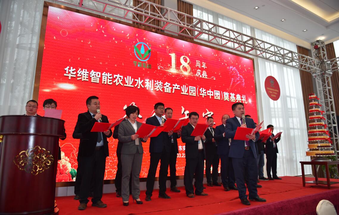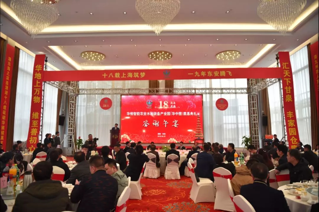 2019年3月22日,华维智能农业水利装备产业园(华中园)奠基典礼在热烈、隆重而简朴的欢庆中礼成。在答谢午宴上,在出席奠基典礼的各位贵宾的见证下,华维集团十八周年庆典系列活动也正式启幕。