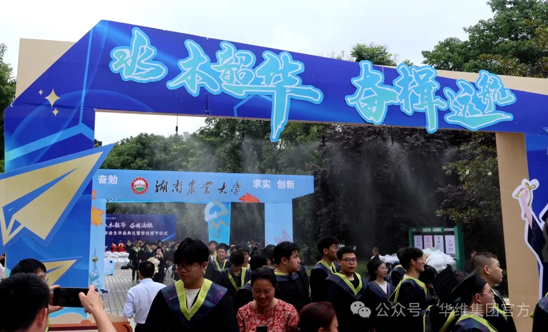 此次毕业典礼设置了三道门,门上有华维提供的“水肥一体化倒挂微喷系统(雾化效果,见上图”,这是水院和华维为学子们精心设计的“水门洗礼”仪式。