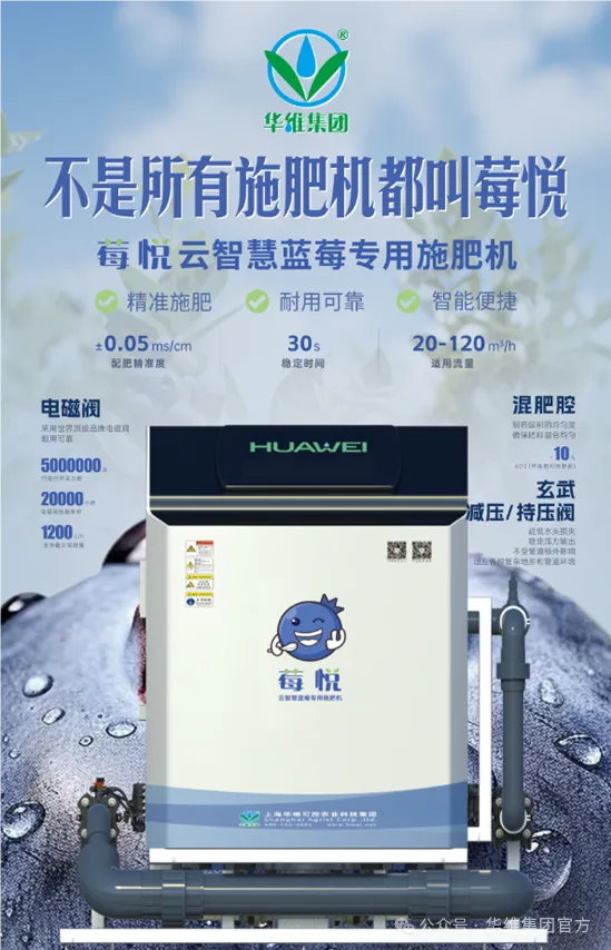 莓悦,在华维“喜耕田云智慧施肥机”的基础上,进行技术和功能的迭代升级,“不是所有施肥机都叫莓悦”的高要求定位,根据蓝莓生长习性和种植生产管理中的实际需求不断调整完善优化,打造一款专为蓝莓而生的“水肥智能保姆”,为蓝莓种植者提供了一种专业的、更加智能高效的灌溉解决方案。