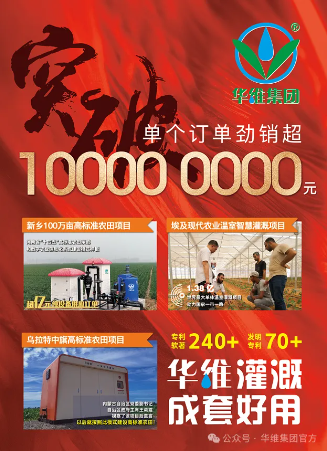 面对未来,华维深知挑战与机遇并存,将继续坚持创新驱动发展战略,持续完善中国原创的“灌溉品牌机”,提升核心竞争力,以更加开放和包容的姿态,携手业界同仁,拥抱智慧灌溉这一“双万赛道”(万年赛道+万亿赛道),迎接行业发展带来的新挑战,共同推动全球智慧灌溉技术的进步,为实现“让耕者富、食者安、产业兴、国家强”的使命而不懈努力。