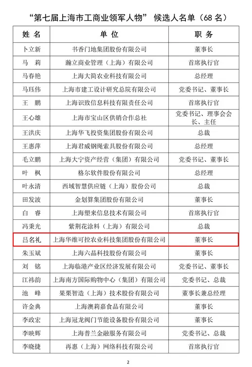 华维董事长吕名礼荣列上海市工商业领军人物