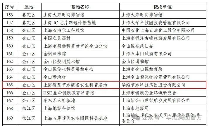 为全面贯彻《中华人民共和国科学技术普及法》《上海市科学技术普及条例》,进一步推进上海科普事业高质量发展,动员全社会力量参与科学普及工作,根据《上海市科普基地管理办法》相关规定,市科委开展了2024年新增市级科普基地认定工作。经各区初审受理、实地考察及专家评审,新增2家示范性科普场馆、9家基础性科普基地。上海智慧节水装备农业科普基地(中国灌溉博物馆)通过年检,入列2025-2026年度上海市科普基地。