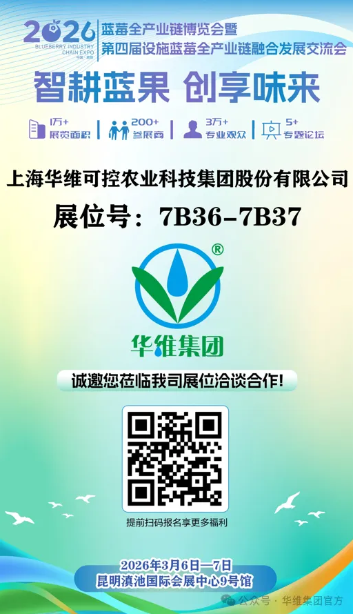 2026蓝莓全产业链博览会暨第四届设施蓝莓全产业链融合发展交流会,即将于3月6日在云南省昆明滇池国际会展中心开幕。华维集团应邀参会,作《可控农业助力蓝莓产业提质增效》报告(3月7日10:30-11:30,9号馆会场一),展示、自动反冲洗叠片过滤系统、蓝莓专用滴箭套装等蓝莓水肥一体化产品、解决方案,“ACA第六谷·蓝莓谷”一站式服务,展位号:7B36-7B37,欢迎各界朋友们垂询!