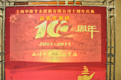 在嘉宾们觥筹交错的同时,晚宴安排了精彩的歌舞、杂技、乐器等表演节目,包括小提琴演奏、东北二人转、杂技、民歌、民族舞蹈、川剧经典变脸艺术等精彩节目,演出节目融汇中外,古典作品与现代艺术交相辉映,更是体现了华维人作为“禹王传人”为中国、为世界提供最好的节水灌溉产品的决心。许复初为华维十周年庆典献唱《同一首歌》并致辞,肯定赞许华维十年走出的辉煌路程。在一片祝福和欢乐声中,嘉宾们纷纷拍照留念,华维十周年庆典圆满落下帷幕