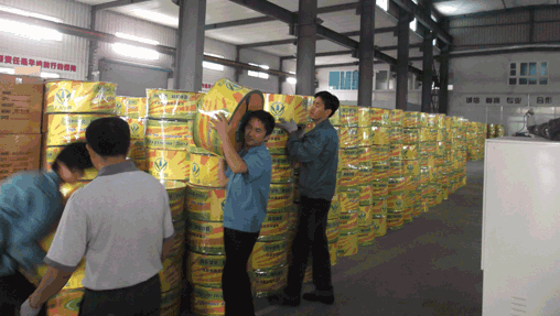 昨日由上海华维独立研制生产的新型蓝色轨道滴灌带从华维奉浦工厂装箱销往西非,图为华维工人正在为滴灌带装箱。