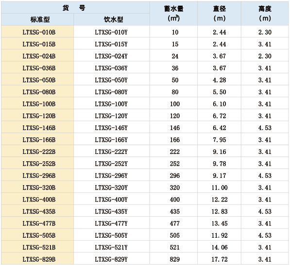 ② 上表所列仅为常用规格,理论上单罐蓄水量没有上限,可以达数千立方米。