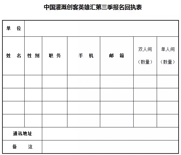(2) 填写附件《中国灌溉创客英雄汇第三季报名回执表》,将回执表用电子邮件方式( ir-hero@foxmail.com )发至中国灌溉创客孵化中心教务处。