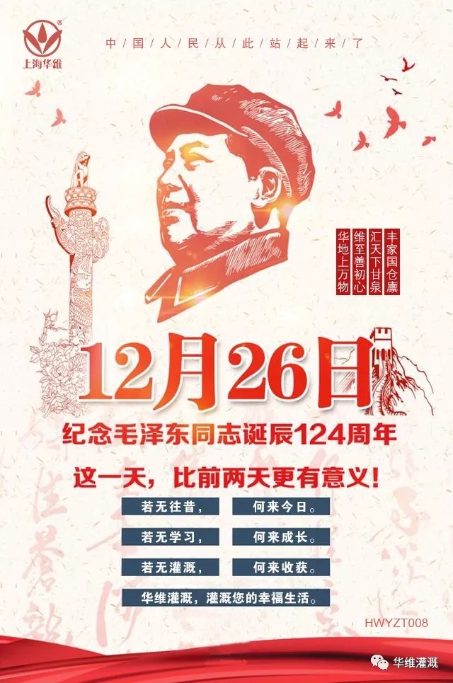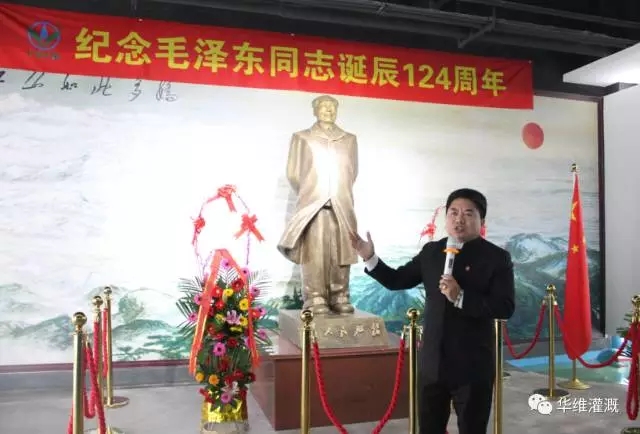 【华维 讯】2017年12月26日12时26分,全体在沪华维员工在中国第一家灌溉博物馆内毛主席雕像前,举行了“毛主席诞辰一百二十四周年”纪念仪式,缅怀伟大领袖的丰功伟绩。