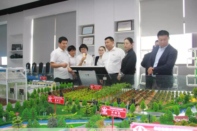 蒙古国中央省省长吉·巴特扎尔格勒(右三)操控华维智慧灌溉系统沙盘展示