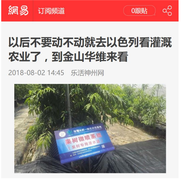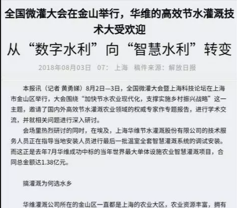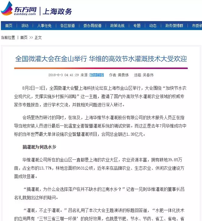 随着华维落户,一个灌溉装备农业新高地在金山区崛起。前不久,金山区委书记赵卫星到华维灌溉公司,就华维院士专家工作站的筹建情况、院士专家组成情况以及主攻方向等进行调研,在听到康绍忠院士和茆智院士对华维的高度评价后不由感慨道:“以后,不要动不动就去以色列看灌溉了,到咱们上海华维来看。”