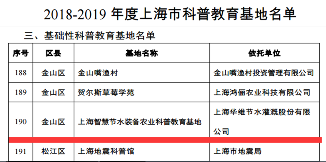 其中,上海华维节水灌溉股份有限公司“上海智慧节水装备农业科普教育基地”作为专题性科普场馆,入选2018-2019年度“上海市科普教育基地”。