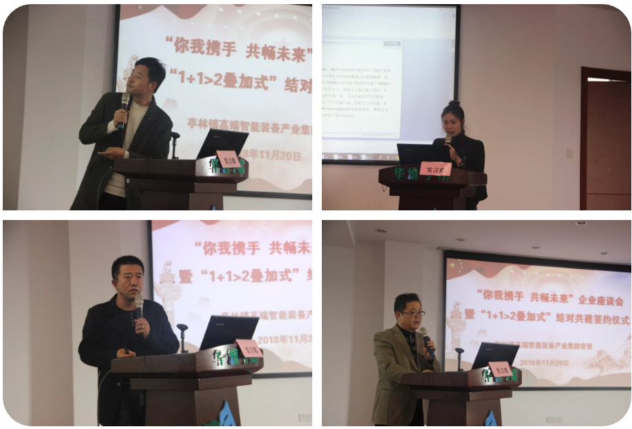 11月20日,亭林镇高端智能装备产业集群委员会首次活动——“你我携手,共畅未来”企业座谈会暨“1+1>2叠加式”结对共建签约仪式在华维节水科技集团股份有限公司(下简称华维集团)举行。镇党委副书记、综合工作党委书记陈军林,区社工委委员、社建办副主任陶海英,集群党委成员出席本次活动,活动由集群党委书记、华维集团董事长吕名礼主持。