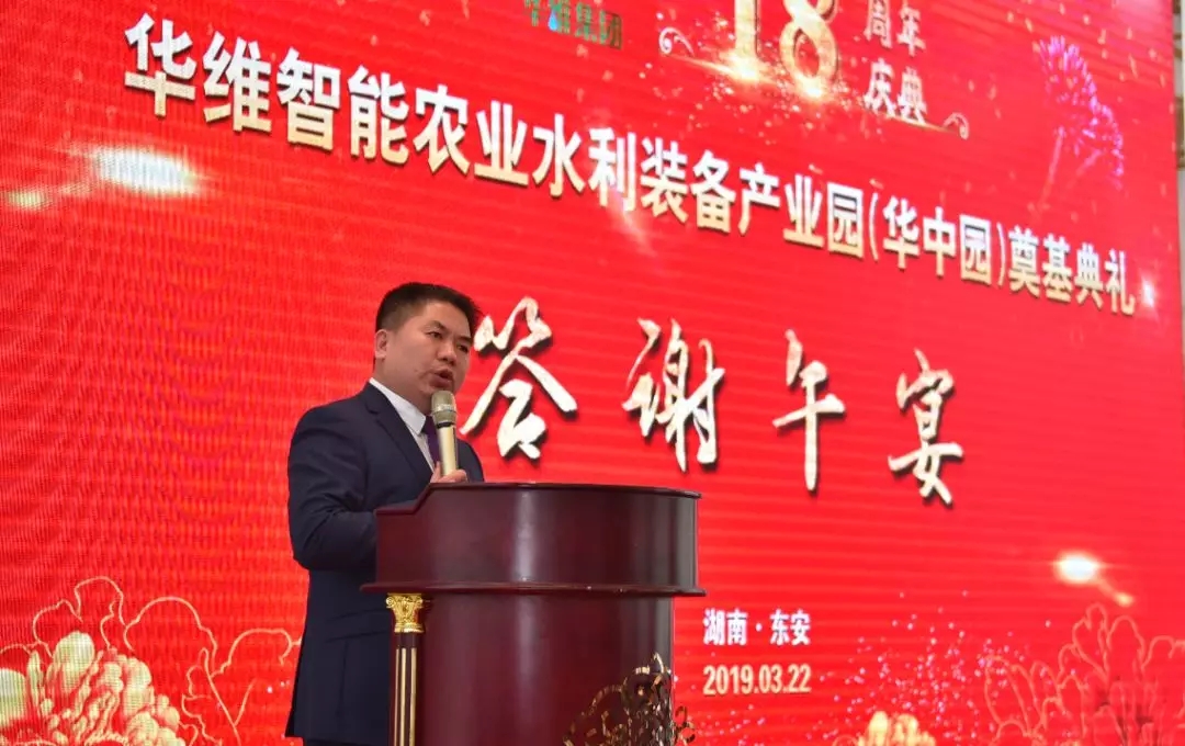 2019年3月22日,华维智能农业水利装备产业园(华中园)奠基典礼在热烈、隆重而简朴的欢庆中礼成。在答谢午宴上,在出席奠基典礼的各位贵宾的见证下,华维集团十八周年庆典系列活动也正式启幕。