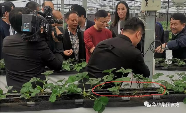 在董家街道红梅农场(扬州大学架式草莓推广基地),马云一行察看并详细询问了草莓多种栽培模式,及配套的水肥一体化及农业物联网系统等现代农业科技装备的应用。配备的华维智慧灌溉系统为马云表演了一段草莓灌溉施肥之舞,C位上镜。