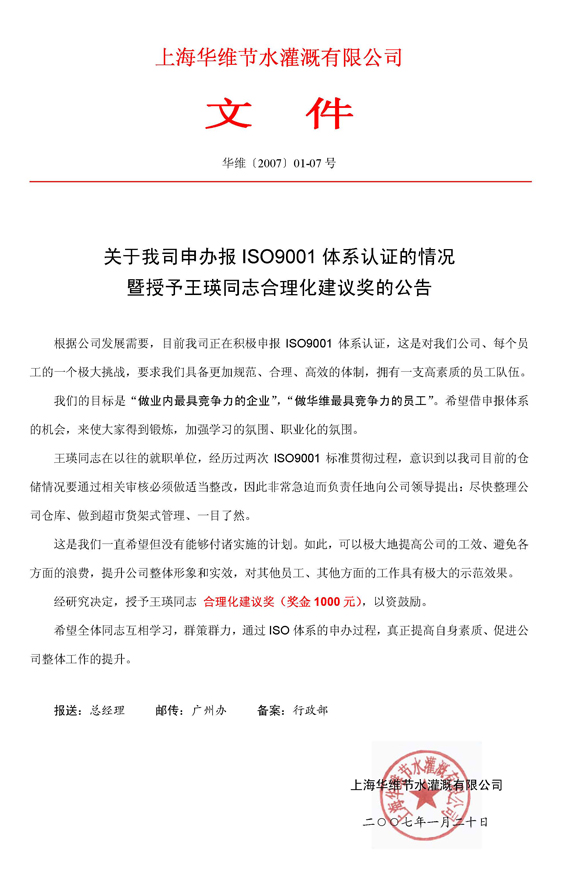 授予王瑛同志合理化建议奖