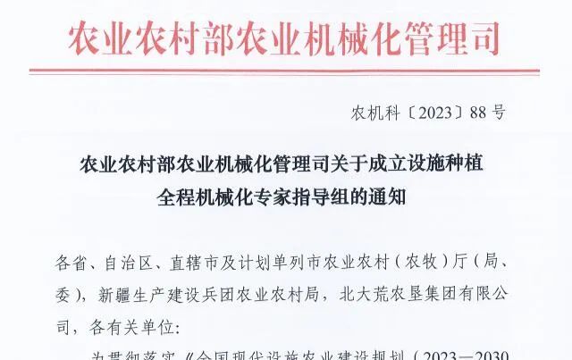2023年9月,农业农村部农业机械化管理司成立设施种植全程机械化专家指导组,更好地贯彻落实《全国现代设施农业建设规划 (2023-2030年)》(农计财发[2023]6号)、《农业农村部关于发展现代设施农业的指导意见》(农计财发[2023]10 号 )《农业农村部关于加快推进设施种植机械化发展的意见》(农机发 [2020]3号 ),更好地发挥行业专家在决策咨询、技术指导、培训交流验收考核等方面的支撑服务作用,推动设施种植全程机械化高质量发展。