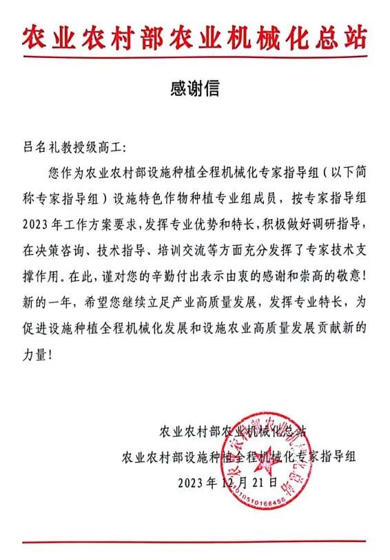 12月21日,农业农村部农业机械化总站发来感谢信,感谢吕名礼在设施特色作物种植专业工作中发挥了专家技术支撑作用。