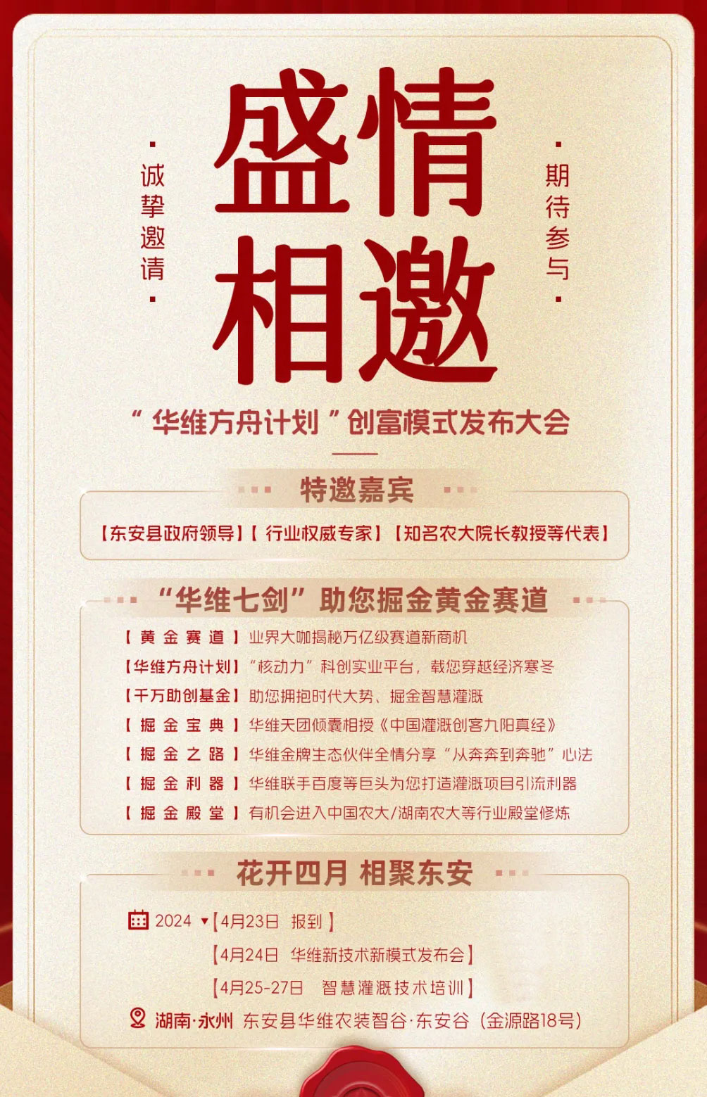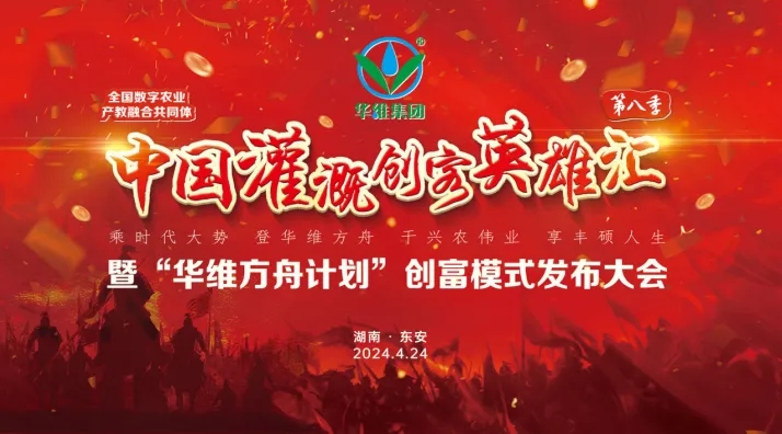 4月24日,灌溉兴农 千万助创——全国数字农业产教融合共同体·第八季中国灌溉创客英雄汇暨华维“方舟计划”创富模式发布大会将在华维农装智谷·东安谷(湖南东安县)隆重召开,花开四月,相聚东安!全新灌溉赛道,全新华维模式,我们热忱欢迎全国客商走进华维,偕手共创智慧灌溉千万梦想。