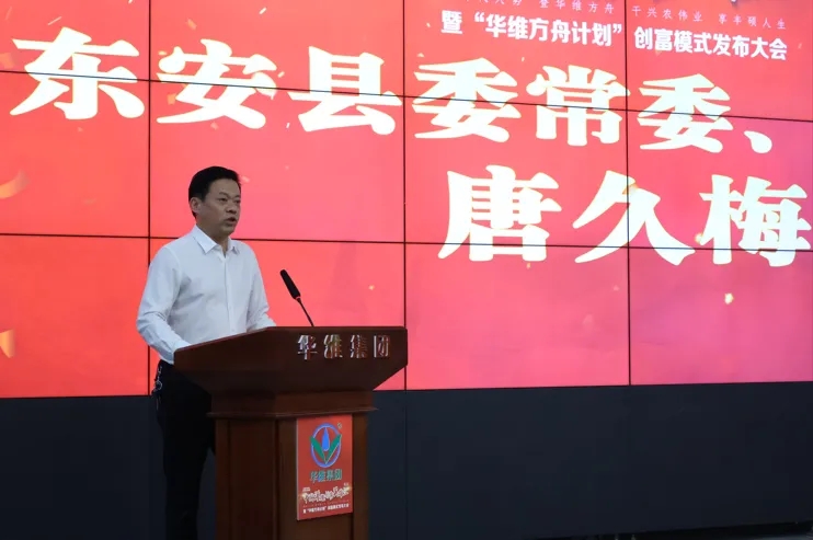 东安县委常委、副县长唐久梅致词,并与华维集团共同揭幕发布“灌溉兴农·千万助创”基金