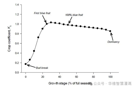 蓝莓属于多年生作物,所以树龄和修剪方式决定的树体大小也决定了其需水量,一般较小蓝莓植株需水量也较少,1~1.5米左右高度的植株往往用水量高峰也只有3L,新种植的蓝莓植株每天用水量约为1~2L,新种植的蓝莓由于根系发育不够健全,往往更容易受到水分胁迫。而目前实际大规模生产中往往采取超额灌溉,灌水量都非常高,同时也造成了大量营养液的浪费。