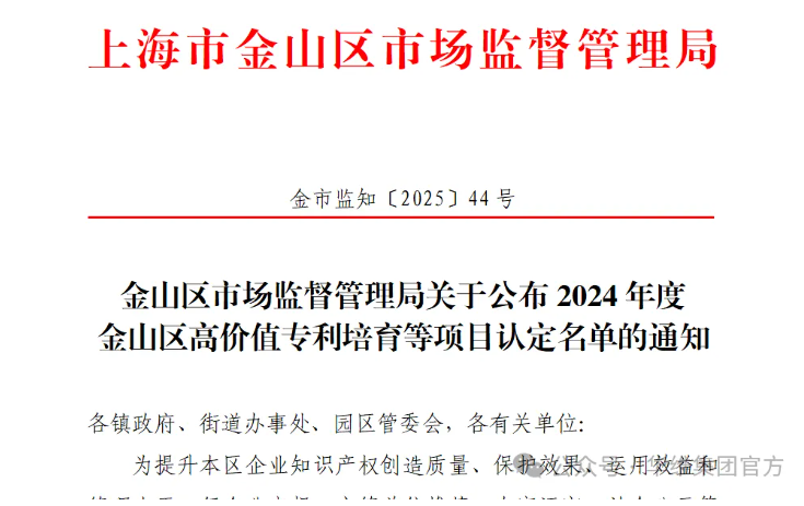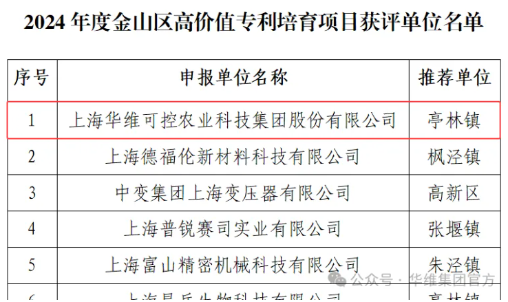 华维集团通过上海市金山区高价值专利培育项目单位认定