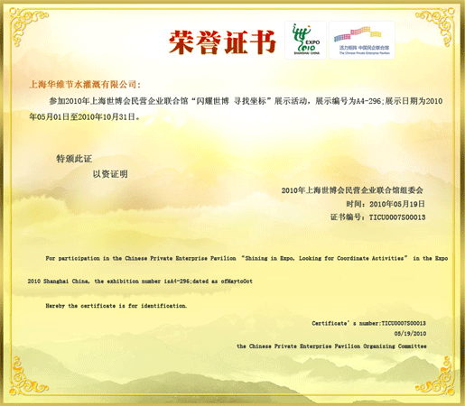上海华维与世博同行荣誉证书