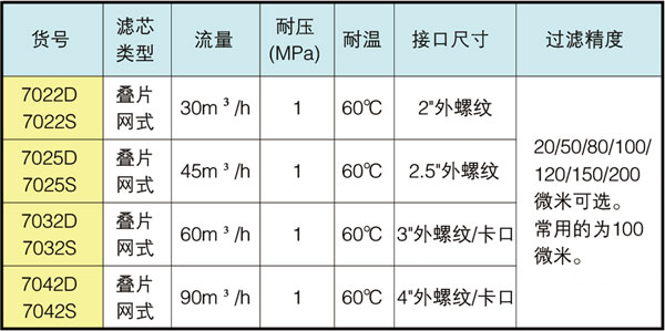 特别加长的滤芯(加大了过滤表面积),如120目的2"单体叠片过流量可达60 m3/h(其他品牌同等规格过流量为50m3/h)。